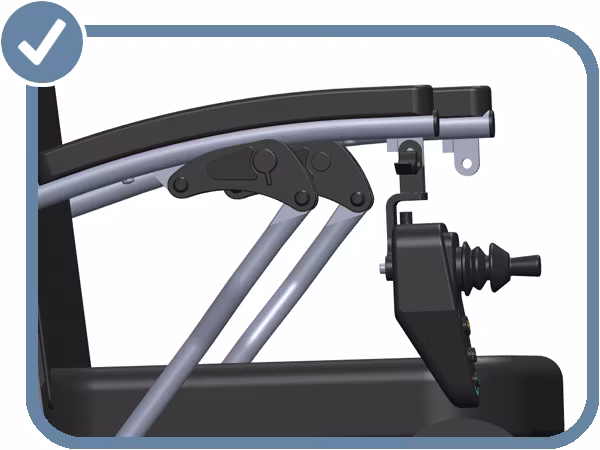 Joystickfästet går att fälla ner för att komma närmre bordskanten. Fotstödet går att fälla in under sitsen vilket underlättar när man ska sätta sig eller resa sig upp.