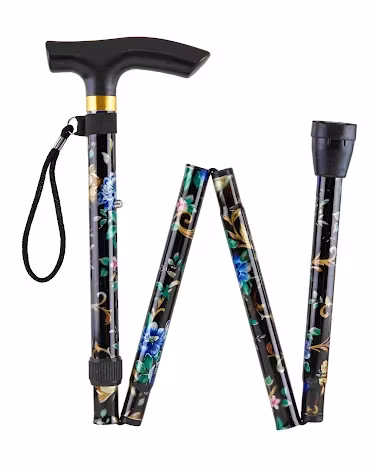 Svart med blommönster Hopfällbar 4-delad käpp av aluminium och handledsrem. Längd hopfälld 30 cm - varierbar längd utfälld 84-95 cm. Rör 20 mm. Handtag som passar både höger och vänster hand. Vikt 320 g. 525 kr LÄGG I KORGEN