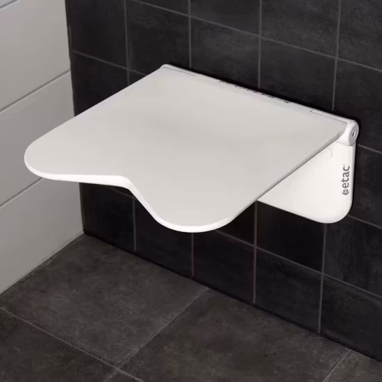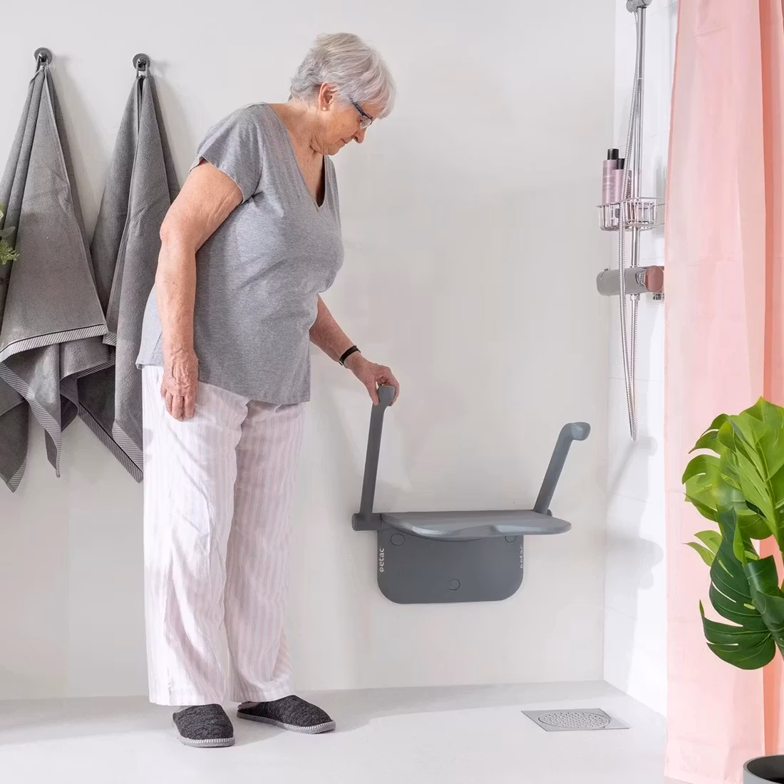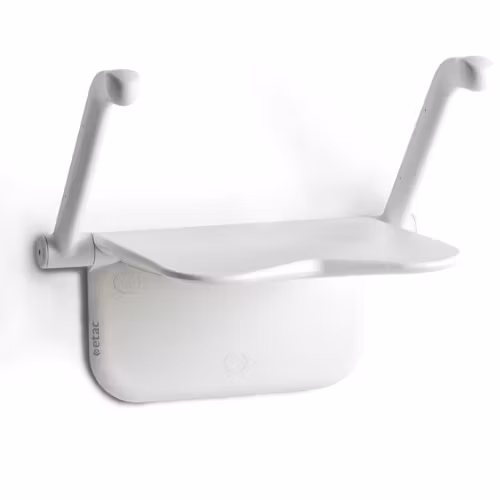 Stor och stadig sittyta när den är nedfälld och väldigt diskret i uppfällt läge. De fällbara armstödens form och material erbjuder ett tryggt och säkert grepp.