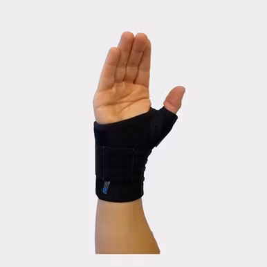 Kort kombinerad tum- och handledsortos utan skena. Ortosen stödjer och avlastar brukarens tumme, hand, handled och underarm efter skada, operation,