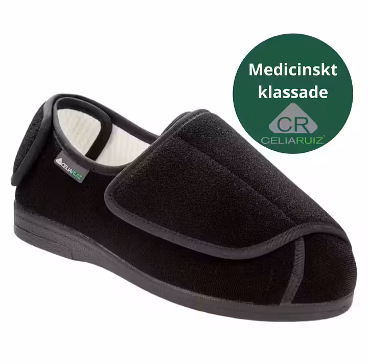 Designad speciellt för personer med olika gångfunktionsbesvär. Skon har bred läst och är lätt att ta på. Tillverkad i ett mjukt bekvämt material. Innehåller inga skadliga kemiska ämnen och tyget är certifierat som OEKO-Tex Standard 100 - enligt EU REACH-föreskrifterna. Bakteriostatiska - förhindrar bakteriell tillväxt. Klassad som medicinteknisk produkt. Finns i storlek 36-48. Tvättbar i 30 grader, lufttorkas.