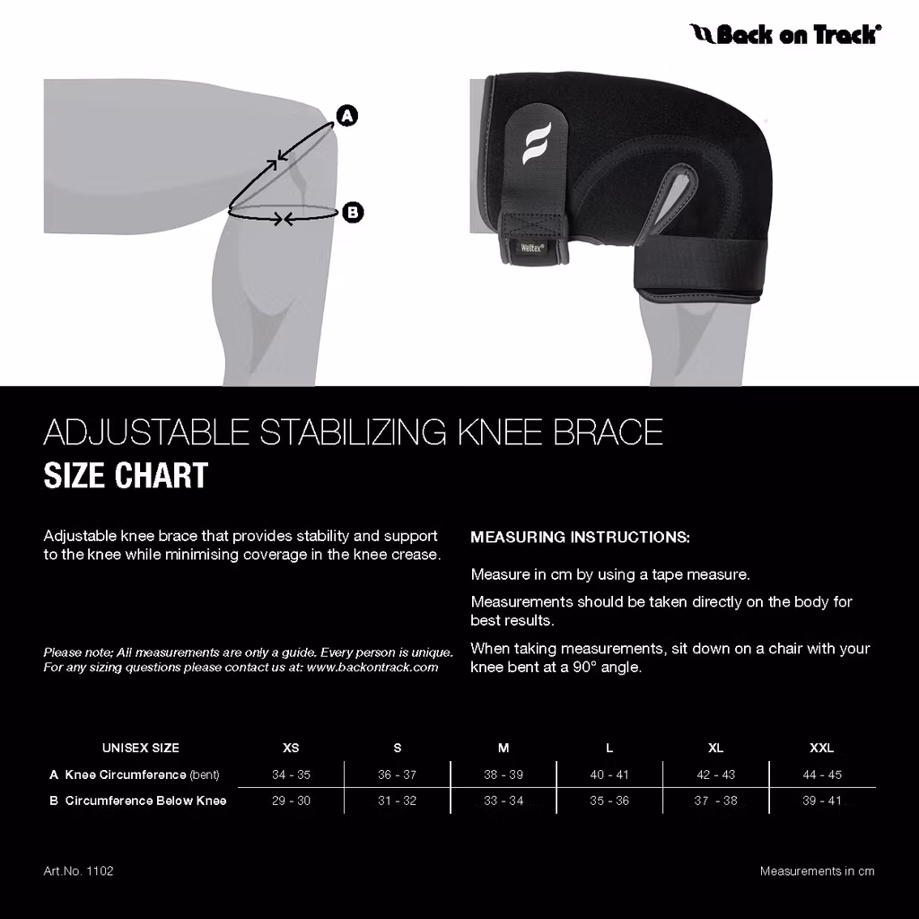 Back On Track. Justerbart knäskydd i stadigt neopren-material som omsluter och ger stöd åt knäleden.